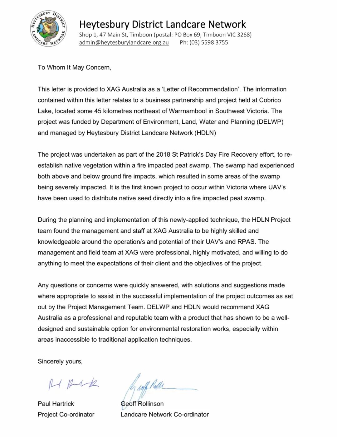 第一阶段工作完成后,澳方向极飞发出了感谢信,对极飞为澳洲生态恢复项目成功开展提供的专业技术支持表达了谢意。