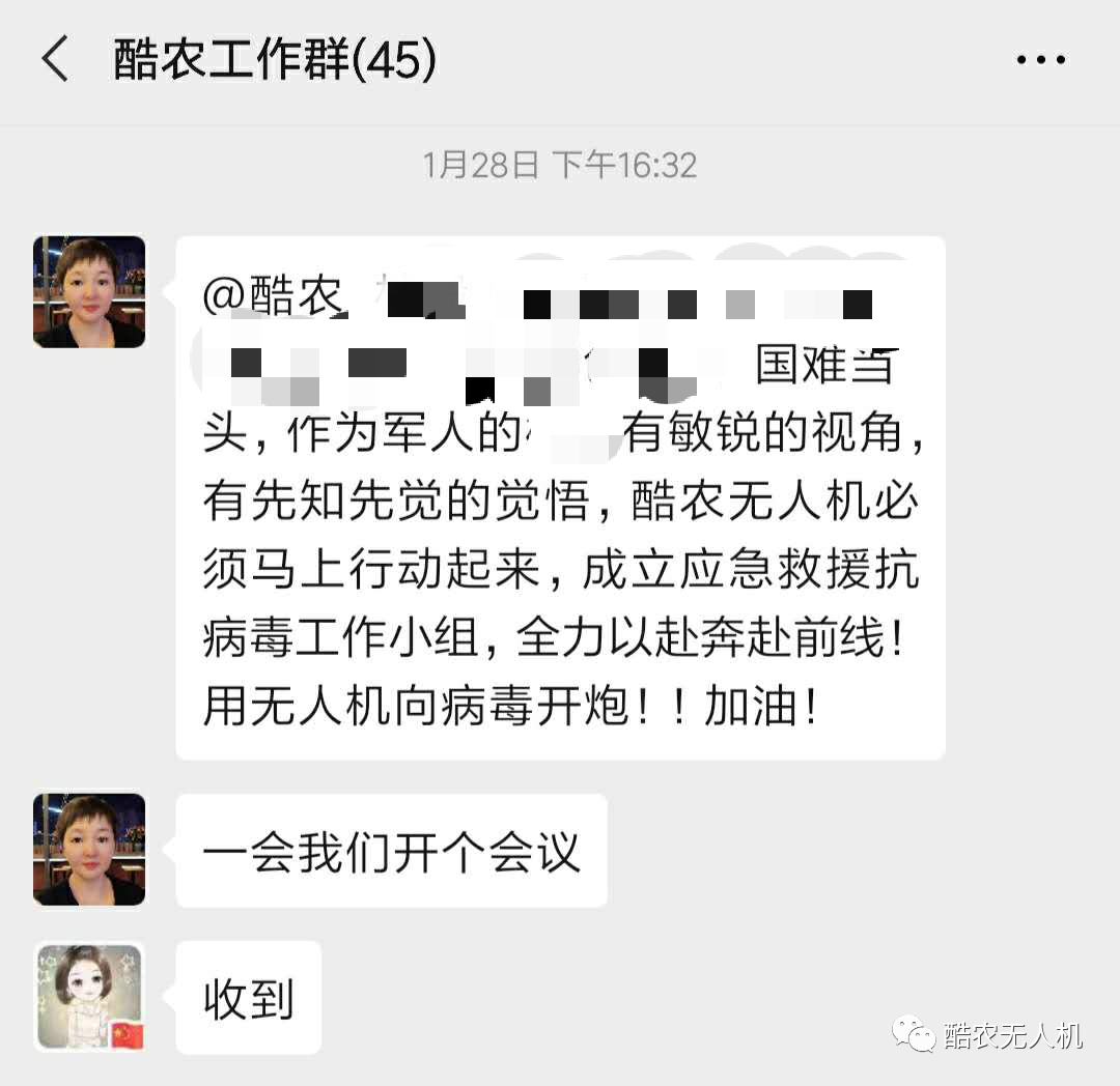 河南省酷农航空植保科技有限公司的董事长安晓女士,在家中每天关注着疫情的新闻动态,心急如焚如坐针毡,同时也被前线报道的抗疫英雄们的事迹感动得热泪眼眶。安晓女士忧心忡忡,心想着,与其这样待在家里干着急,不如把大家组织到一起,在公司力所能及的范围内为抗疫出一份力!在1月28日下午,安晓女士在酷农工作群里通知群里的公司管理人员,随即展开疫情会议讨论。一方面因为疫情期间,政府为防止疫情扩展,严令限制人口自由流动,因此需要向当地政府部门报备,拿到车辆通行审批;另外迅速组织酷农的飞手,调用车辆和无人机成立疫情防控消杀队,通过植保无人机喷洒消毒液;酷农的小伙伴们自发组织捐款活动,部分用于采购消毒防护物资,其余款项全部捐赠到抗疫前线!