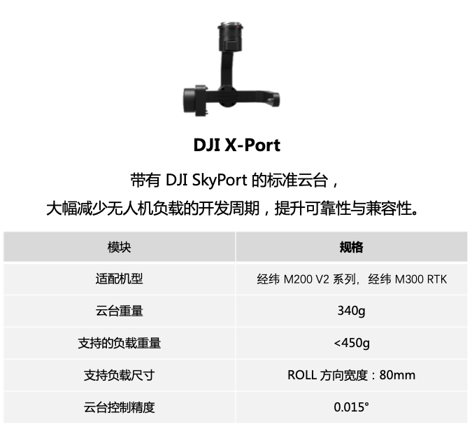 DJI X-Port 标准负载云台:完整的云台功能、全功能开放的 API 接口、极高的兼容性和可靠性,以及平民化的开发成本与便捷的购买方式,再一次降低开发门槛,提升开发效率。