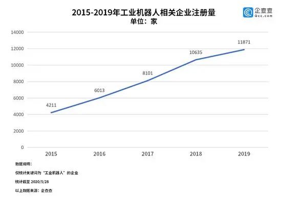 工业机器人在工业生产中能代替人做某些单调、频繁和重复的长时间作业,或是危险、恶劣环境下的作业,其广泛应用于汽车制造、电子电气等行业。企查查显示,目前我国与工业机器人相关的在业、存续企业一共有5.6万家,其中数量最多的省份是广东省,共1.5万家。2019年,我国工业机器人相关的企业一共新注册1.2万家,同比上涨11.6%。2020年1月至今,我国工业机器人相关的企业一共新注册6802家。