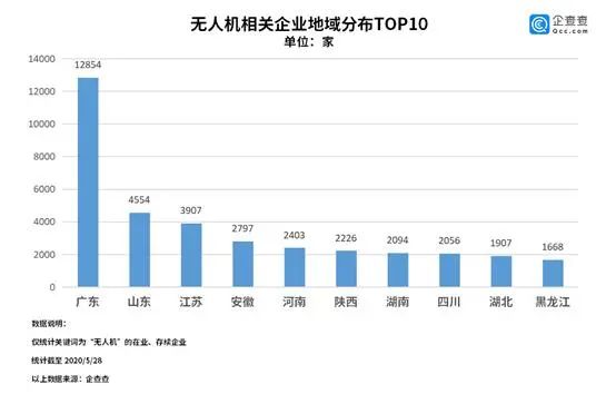 从地域分布来看,企查查数据显示,我国无人机相关企业数量最多的省份是广东省,共1.3万家;山东省排名第二,共0.5万家;江苏省排名第三,共0.4万家。
