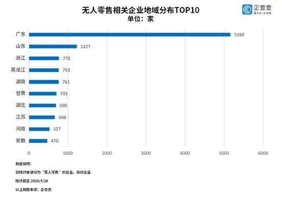从各省份分布来看,企查查数据显示,目前我国无人零售相关的企业数量最多的省份是广东省,共5160家,山东省和浙江省位居第二和第三,分别为1227家和770家。今年1月份至今,我国无人零售相关的企业一共新注册1837家。去年同期新注册量是1454家,相比去年,今年前5个月注册量同比上涨26.3%。