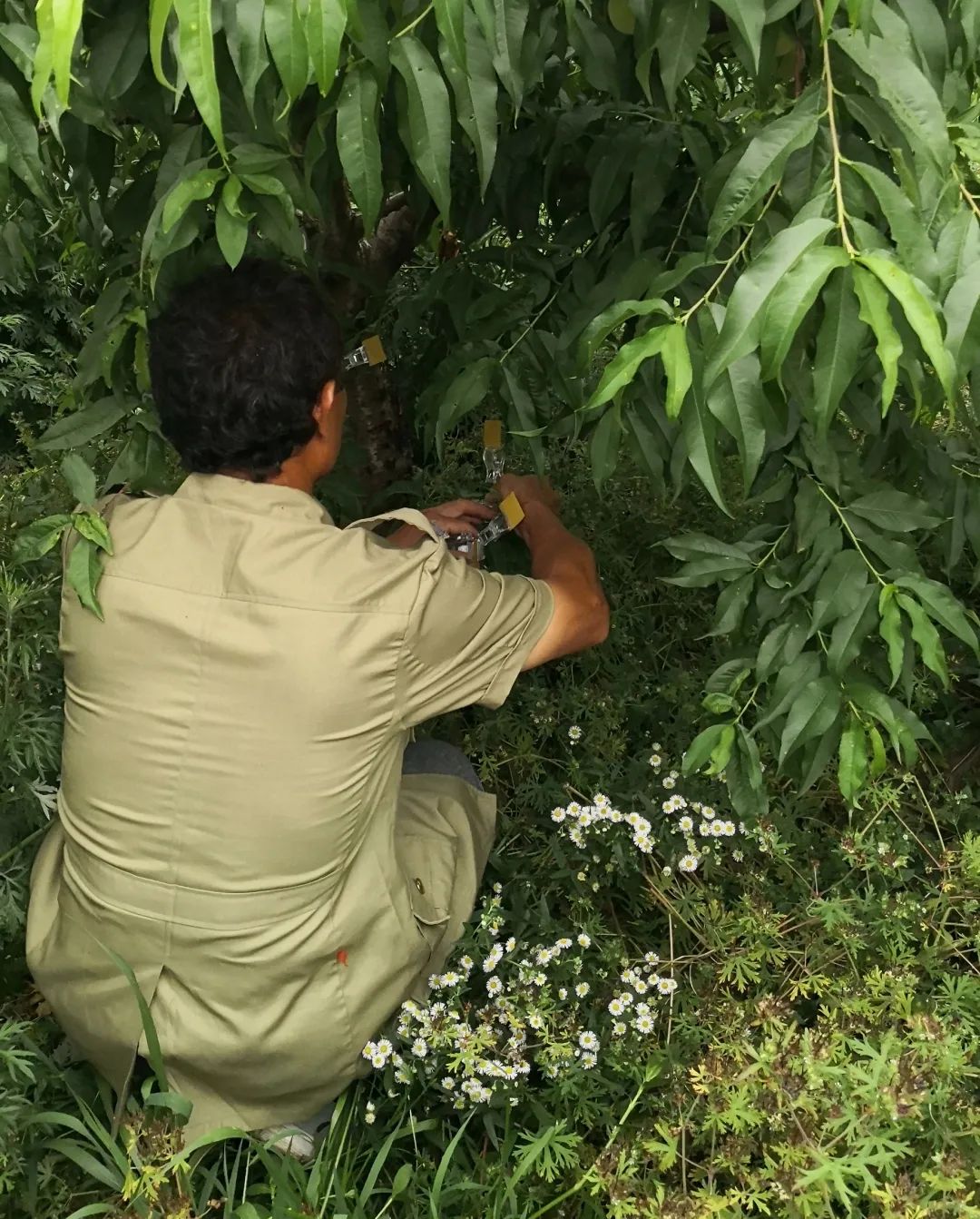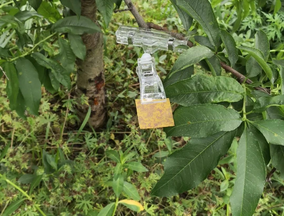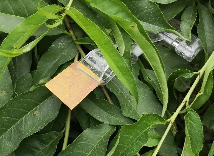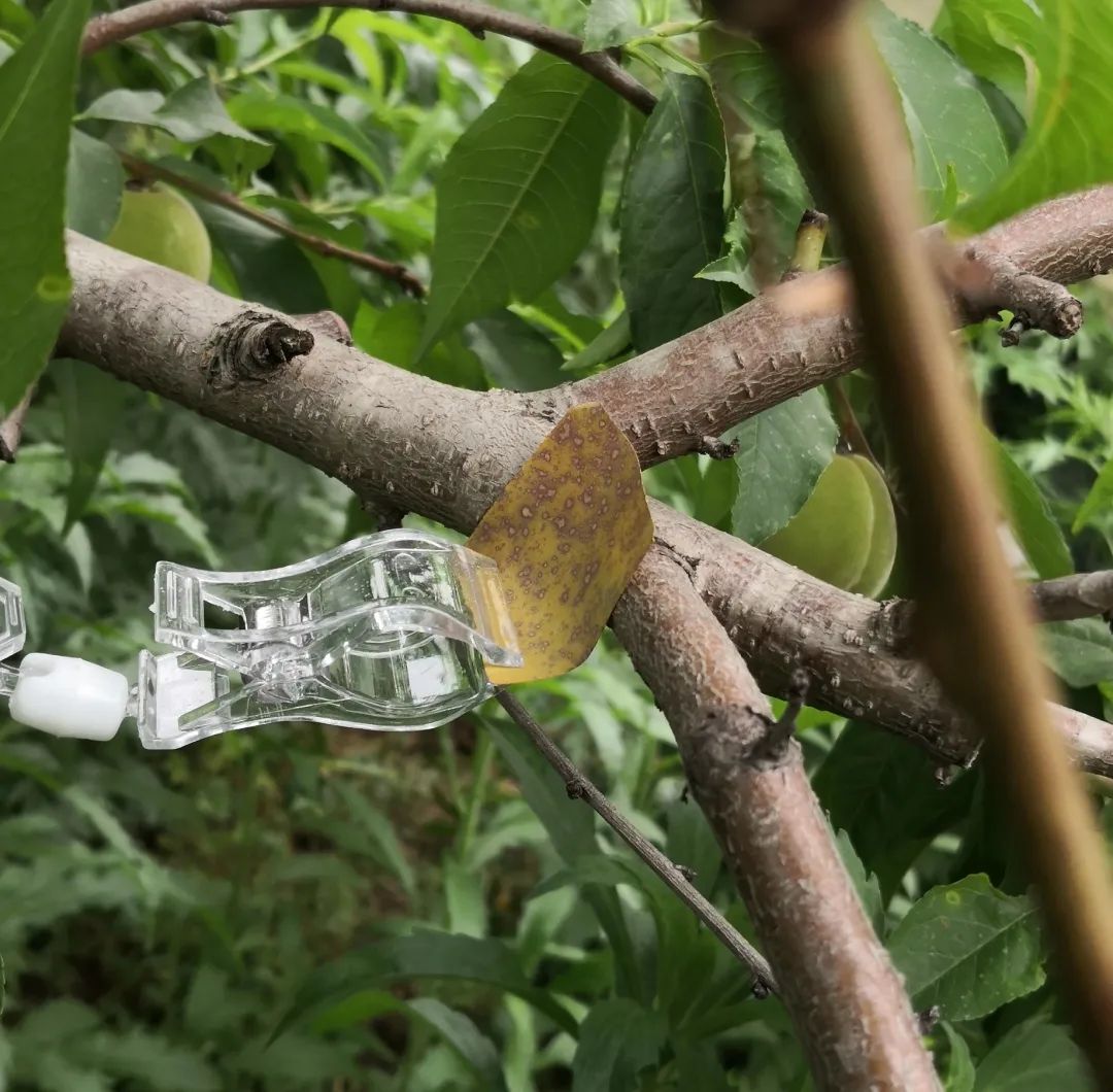 拓攻技术人员和桃园主人一起把水敏纸夹到了桃树上,在不同高度、不同朝向、不同叶密度的多个位置放置水敏纸。