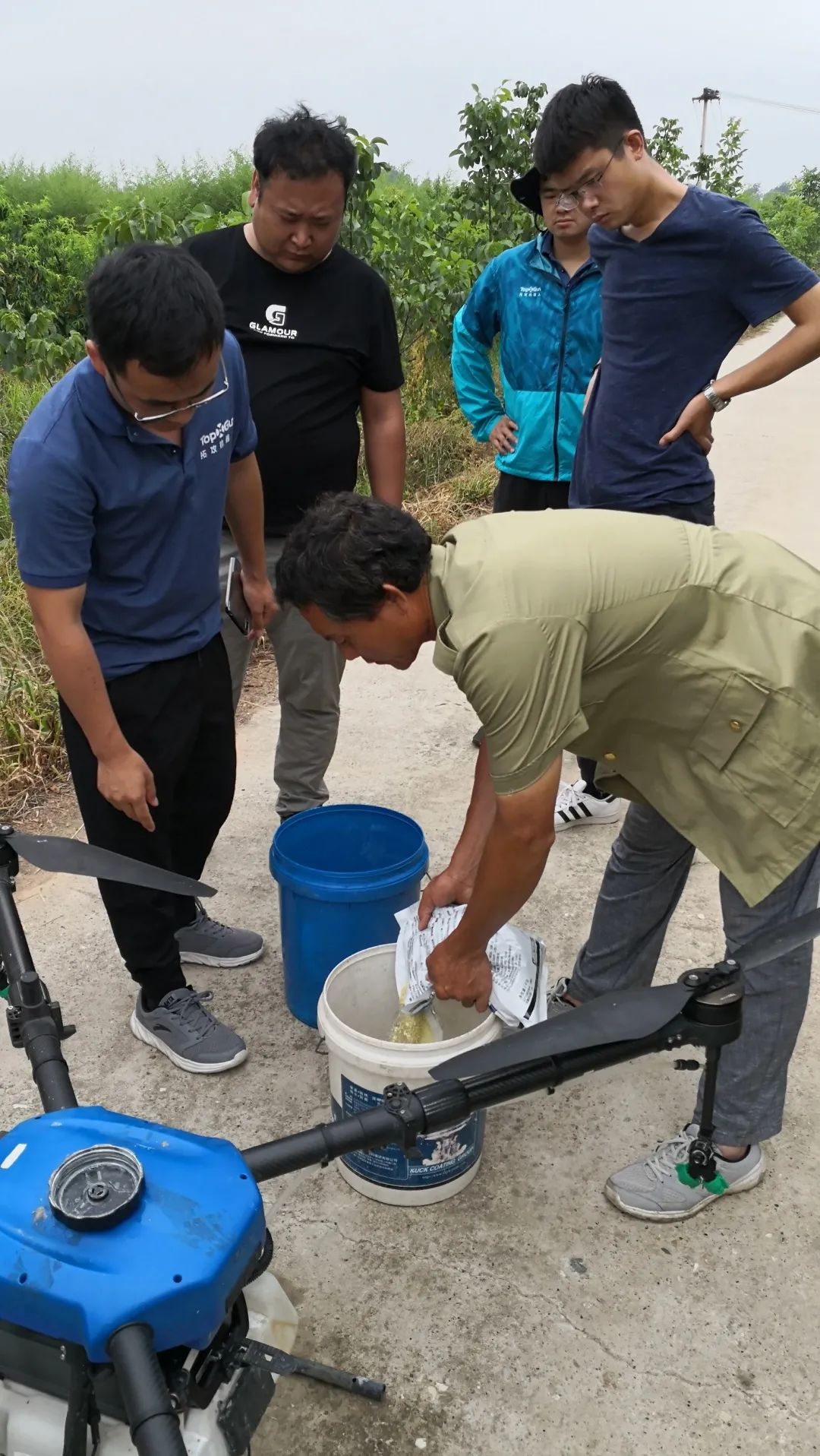本次作业农户要求用的是诺普信代森锰锌,这是一种用于杀灭真菌并在叶面上形成保护膜的可湿性粉剂。拓攻人员根据药袋上的说明,计算出了加水量进行配制。