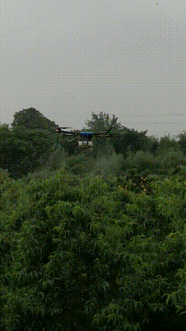 随后飞手操作无人机进行了一次喷洒。无人机的流量开到4L/min、并保持低飞,有助于药物穿透叶片层叠较密处。四旋翼产生稳定的下压风场使叶片扰动,确保叶片反面也能打到药剂。