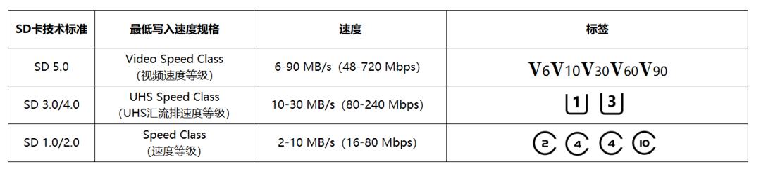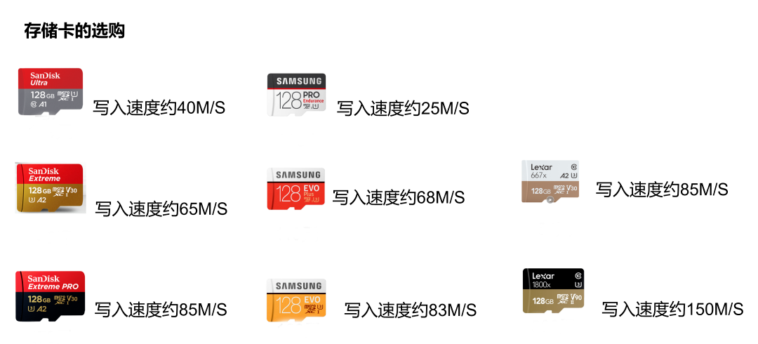 如果想拍摄高清 4K 视频,存储卡的读写速度还需要更快。相机在存储卡上写入数据时, 我们会看到一个蓝色的圈在软件界面的相机快门按键处旋转。存储卡的速度等级越高,其写入速度就越快,相机进行下一次拍摄的反应时间也就越短。存储卡的速度快慢在拍摄 4K 100Mbps 码率视频时表现尤为明显。这里为大家列一个存储卡的不同等级清单,仅供参考。