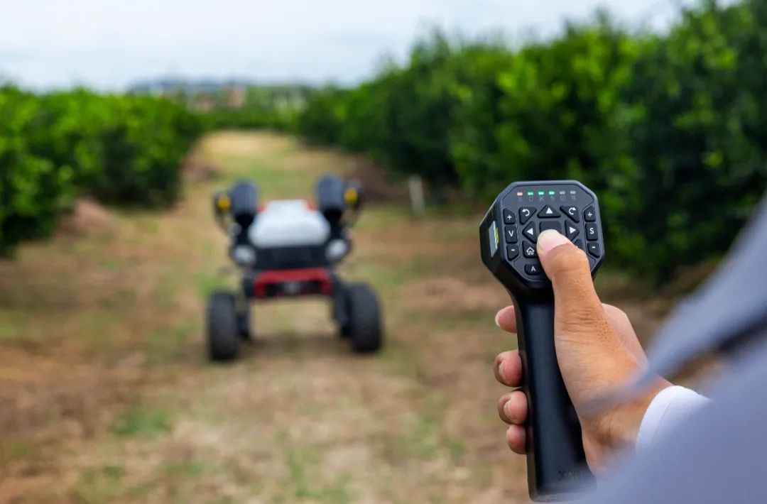 而在操作上,此次 R150 农业无人车的操作系统继承了极飞农业无人机操作系统智能化的优点。手机 App上自动生成作业路径后, R150 农业无人车即可全自主作业,多种航线模式适应多种场景,让用户省心省力。除了App,随车配备的单手操纵杆也能轻松操控,进一步降低了使用门槛。用户可以手持操纵杆走在车前,R150 农业无人车就能在后面自动跟随,也可使用操纵杆直接进行遥控,像遥控电视机一样简单,5 分钟就能轻松上手。