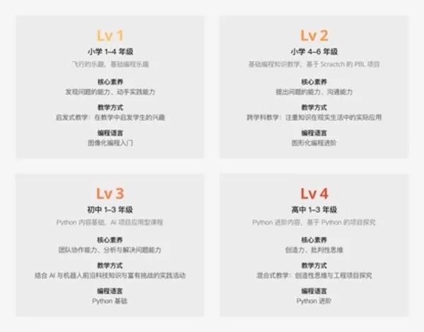 此次RoboMaster TT配套的无人机与人工智能系列课程,针对不同学龄段设置了4个不同学习等级,学生学龄由小学一年级覆盖至高中三年级。