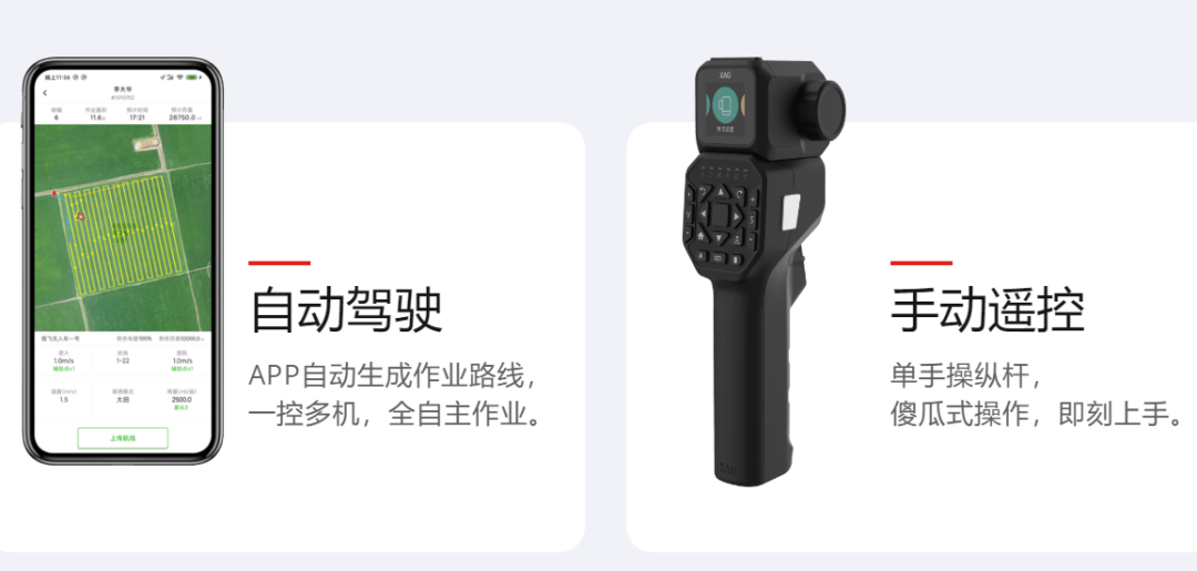 除了使用单手操纵杆进行手动遥控外,还可以通过手机 APP 自动生成作业路线,进行自动驾驶,实现无人化作业。