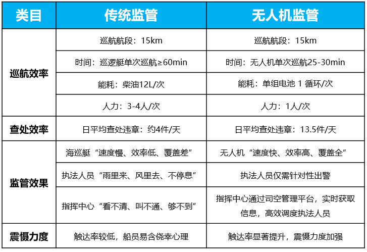 自该海事局投入使用大疆无人机以来,不仅有效降低了轮艇工作强度,每日可减少单艇2小时轮艇出动、节省约 36 L 燃油消耗,还提高了海事监管的触达效率,极大增强了海事监管覆盖能力,取证时间也由原来调查笔录的2小时缩短到10分钟内,动态船舶监管能力得到提升,水域乱停乱靠现象得到有效遏制。