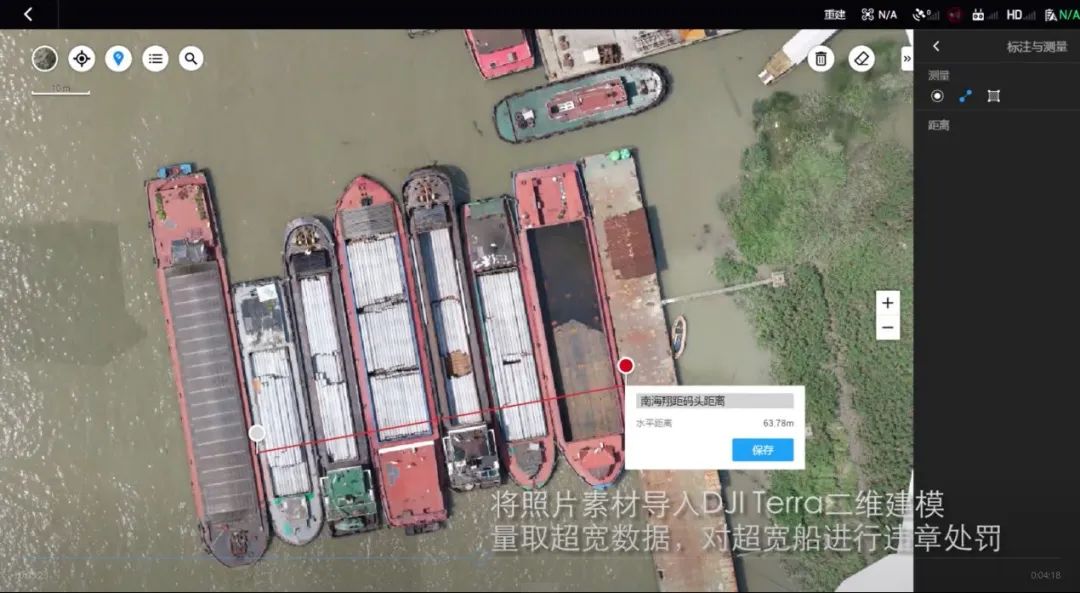 在航线巡查任务中,无人机发现一码头存在超宽靠泊现象,工作人员立即打开网格线设置,参照九宫格标线位置控制无人机完成该码头俯拍照片的获取。同时多角度拍摄涉事船舶的船名标号,通过协同平台确认船舶信息。随后将照片导入大疆智图生成二维正射影像,快速测量每一档船舶的超宽数据,并制作《海事行政处罚决定书》送达当事人。