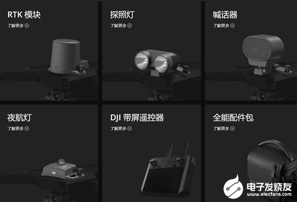 套装除无人机外还包括,电池、DJI 带屏遥控器、喊话器、探照灯、夜航灯等配件。