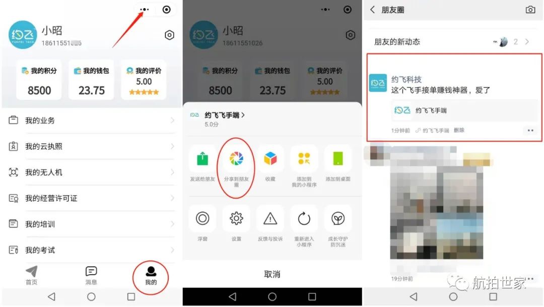 领取方式:完成注册后,将本文发朋友圈或者将飞手端小程序发朋友圈(发圈方法见下图),向在线客服提供发圈截屏后,将收到一个测试订单,接单后可模拟进行业务操作,将有30元订单收入转入“我的钱包”,可随时提现。这个测试订单号很有用哦,将用于下面的抽奖呢!(将小程序发圈仅限安卓手机,苹果手机发圈方法请咨询在线客服)