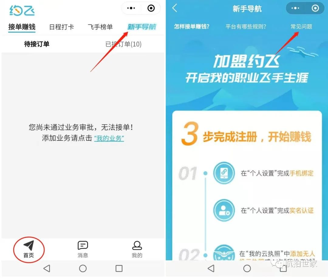 方法一:打开约飞飞手端小程序,点击首页右上角“新手导航”,里面有注册常见问题及解答(见下图)