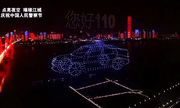 伴随着《英雄》的歌曲,无人机编队在空中构成 人民警察警徽、“您好110”、“警民心连心,携手铸平安”等兼具艺术性和科技性的编队画面。配合编队阵型和灯光变化,为武汉两江四岸的市民百姓和全国的电视观众呈递了一场完美、惊艳的无人机编队灯光表演。