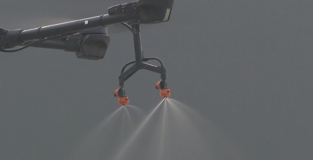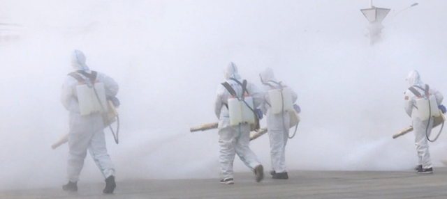 我们了解到今天总共是配备了15台弥雾机以及3架无人机,将会共同执行这次消杀作业。