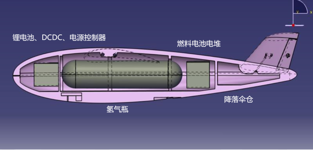 翌翔团队为无人机设计了并联式锂电池/燃料电池混合动力系统方案。燃料电池运行额定功率和无人机巡航功率匹配,当无人机处于巡航状态时,燃料电池单独工作为无人机提供动力,当无人机处于弹射起飞或机动飞行的状态时,燃料电池和锂电池共同工作为无人机提供动力,燃料电池处于额定工作状态,锂电池为无人机提供其余部分能量。这种方案充分发挥了燃料电池动力系统高能量密度的特点,为无人机提供长时间的续航能力,同时利用高功率密度的锂电池解决燃料电池系统功率密度较低的问题。
