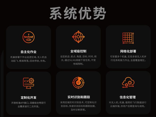 机巢部署于作业巡逻区域,无人机自动起飞、精准降落、回收停放、充电,航迹、航点、角度、目标、时间、频次均通过5G/4G网络下发任务,无人机、机巢、载荷的飞行数据进行云端存储,供用户后期查询与调用。此外,还开放标准API接口,深度结合特定行业需求进行二次开发。系统可以广泛应用于安防巡逻、电力巡检、交通管制、工地监管、林业巡查、农业监测等领域。