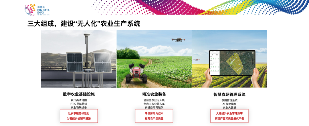 彭斌在主旨演讲中提到,今天中国农业老龄化、空心化严重,极飞科技一直致力于提升农业生产效率,希望通过构建无人化农业生态系统来解决中国农业遇到的问题。目前极飞科技正从数字农田基础设施、精准农业装备、智慧农场管理系统这三个方向建设无人化农业生态系统,每个方向都与农田大数据有关。