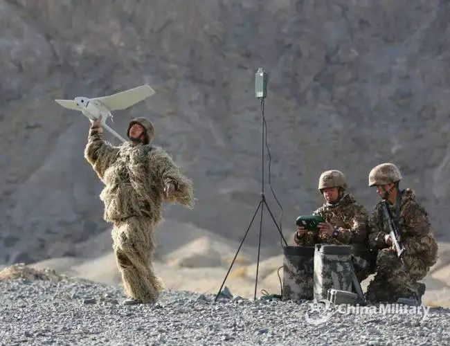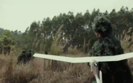 演习当日,草丛间几个人影闪过,原来是之前潜入的特种部队,此时已经换上吉利服,借助茂密的林地环境向内深入。“嗡……”随着一阵类似虫鸣的声音,一架单兵手抛无人机滑向天空,打响了行动的“第一枪”。近年来,诸如KVB206超近程无人机、CH-902超近程无人机等2公斤级无人机广泛列装解放军部队,常见于各种特战部队和合成部队侦察兵。这类采用手抛起飞、滑翔降落的操纵模式,具备体积小、重量轻,可执行昼夜全天候侦察任务。