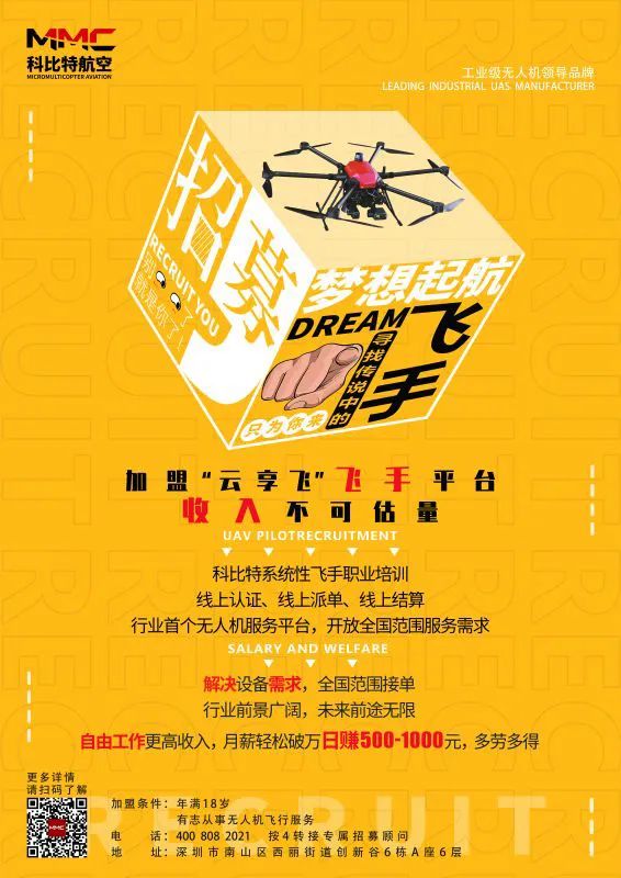 科比特“云享飞”飞手平台正面向全国招募大专及职业院校、无人机生态圈的飞手,在这里,你可以得到平台提供的系统性的飞手职业培训,让自己的飞手前景更加广阔,钱途无量。