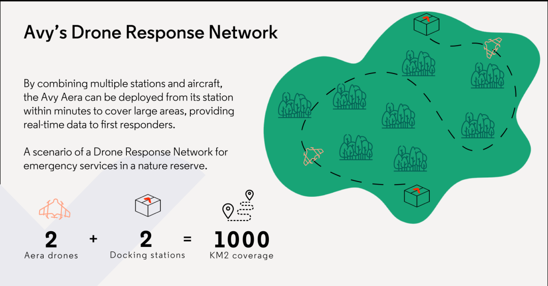当多架飞机作为无人机响应网络的一部分被使用时,Avy Aera可以在几分钟内部署,覆盖大片区域,为第一反应者提供实时信息。例如,在一个场景中,两个无人机站和两架无人机被战略性地放置,该网络可以覆盖1000平方公里的区域。