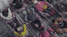 垂直方向上的运动,再加入方向轴和水平的混合运动会发生更奇妙的变化!譬如下图,从一个享受着东北风味的冰上娱乐项目的人们脸上拉开,一直到看到东北风味的拖拉机拉着他们一起奔驰: