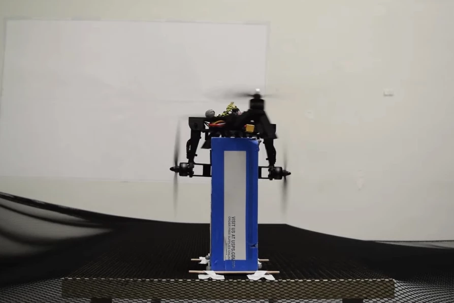 因此,现在更窄的无人机能够顺利和稳定地通过开口。由于两个折叠的手臂实际上是在互相推挤,它们也可以通过从任何一侧捏住一个平坦的盒子来抓住它。然后,该盒子可以被抬起,在空中飞行,并在另一个地方释放。