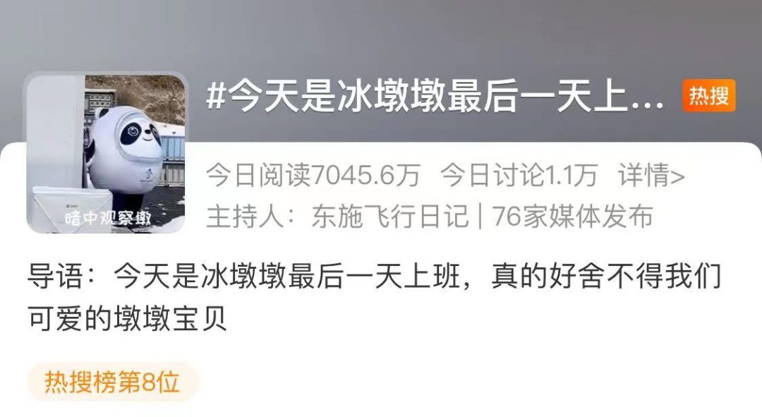 冰墩墩的调皮可爱给大家带来了好多快乐!网友对它的称呼也越来越不见外从客气的大名“冰墩墩”直接变成“墩子”最后一天上班咱们墩依然很卖力站好最后一班岗!