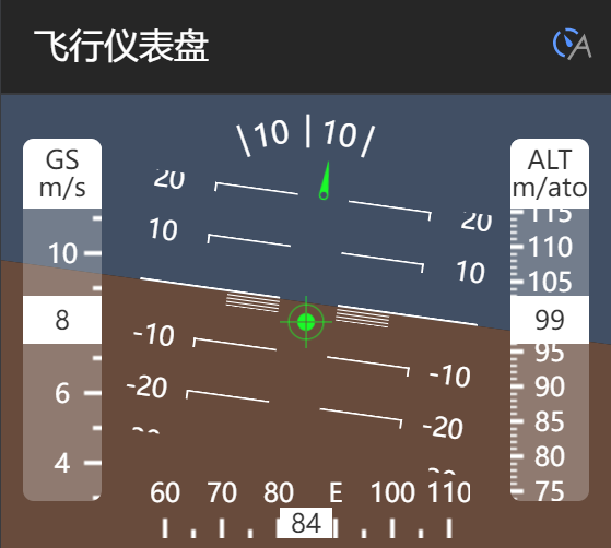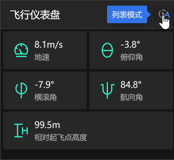 最下方为航向角指示。左侧的GS代表相对地面速度,右侧的ALT为相对起飞点高度。需要注意的是,HUD视图是以飞机视角进行显示的,图中虽然看上去是在向右横滚,其实飞机是向左横滚的——想象自己坐在飞机上,当飞机向左倾斜时,是不是地平线看上去时朝右倾斜的。点击右上角的模式切换按钮后,还可以查看具体的数值,正常在飞行中直接查看图表即可。