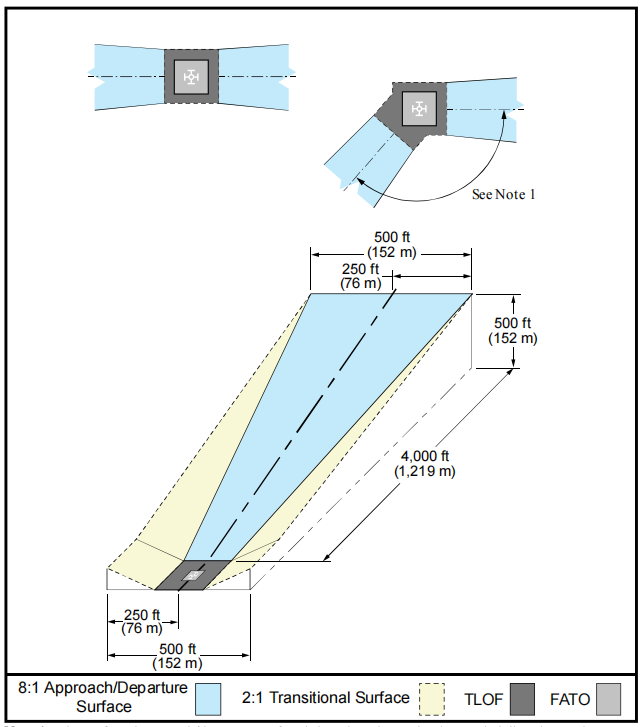 14 CFR Part 77《直升机场通航空域的安全、有效使用和维护》中定义的假想面适用于垂直机场,包括主面、进近面和过渡面。