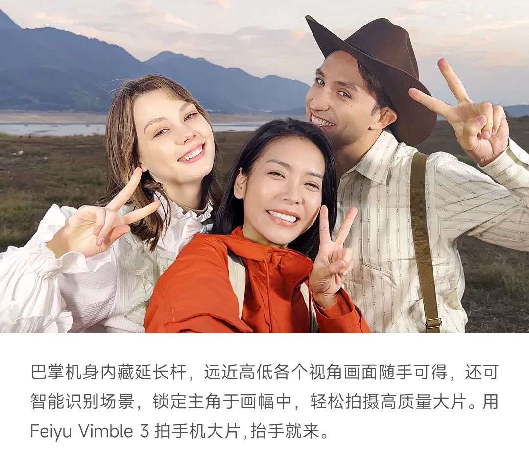 用飞宇Vimble 3拍手机大片,抬手就来。三轴增稳技术搭配延长杆,轻松斩获远近高低各个视角的画面,同时可扩展补光灯和AI跟踪模块,解锁更多新奇玩法,手机拍摄体验全线拉满。