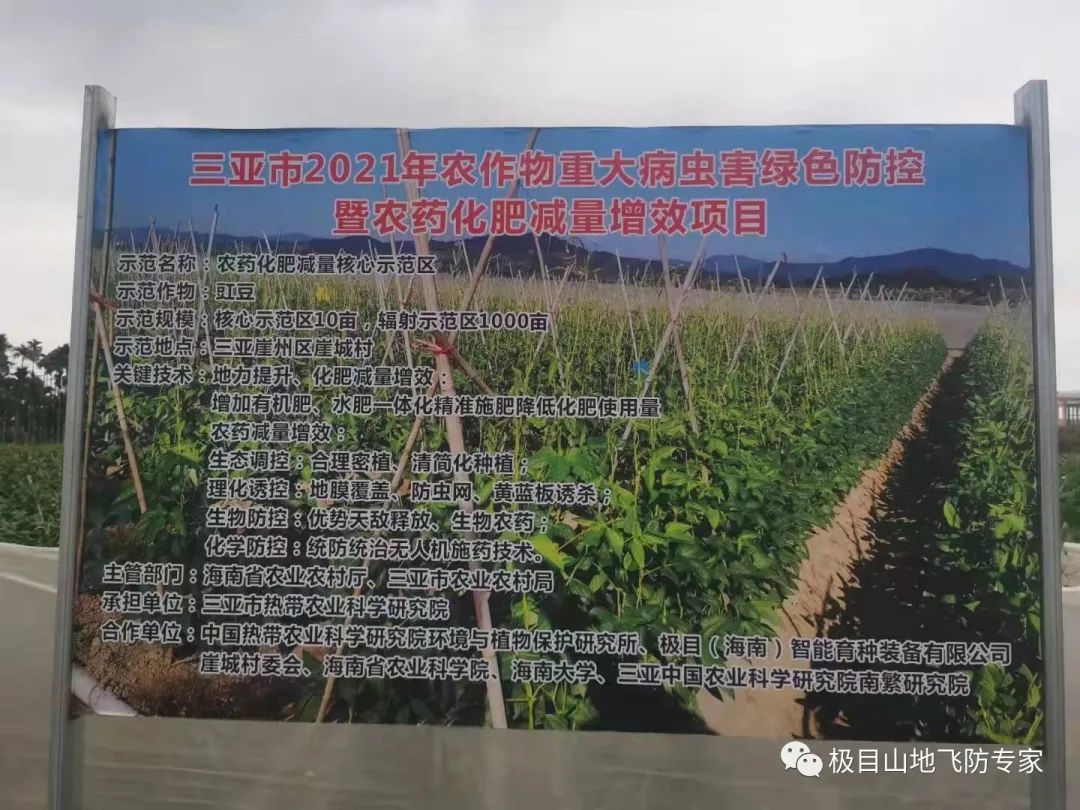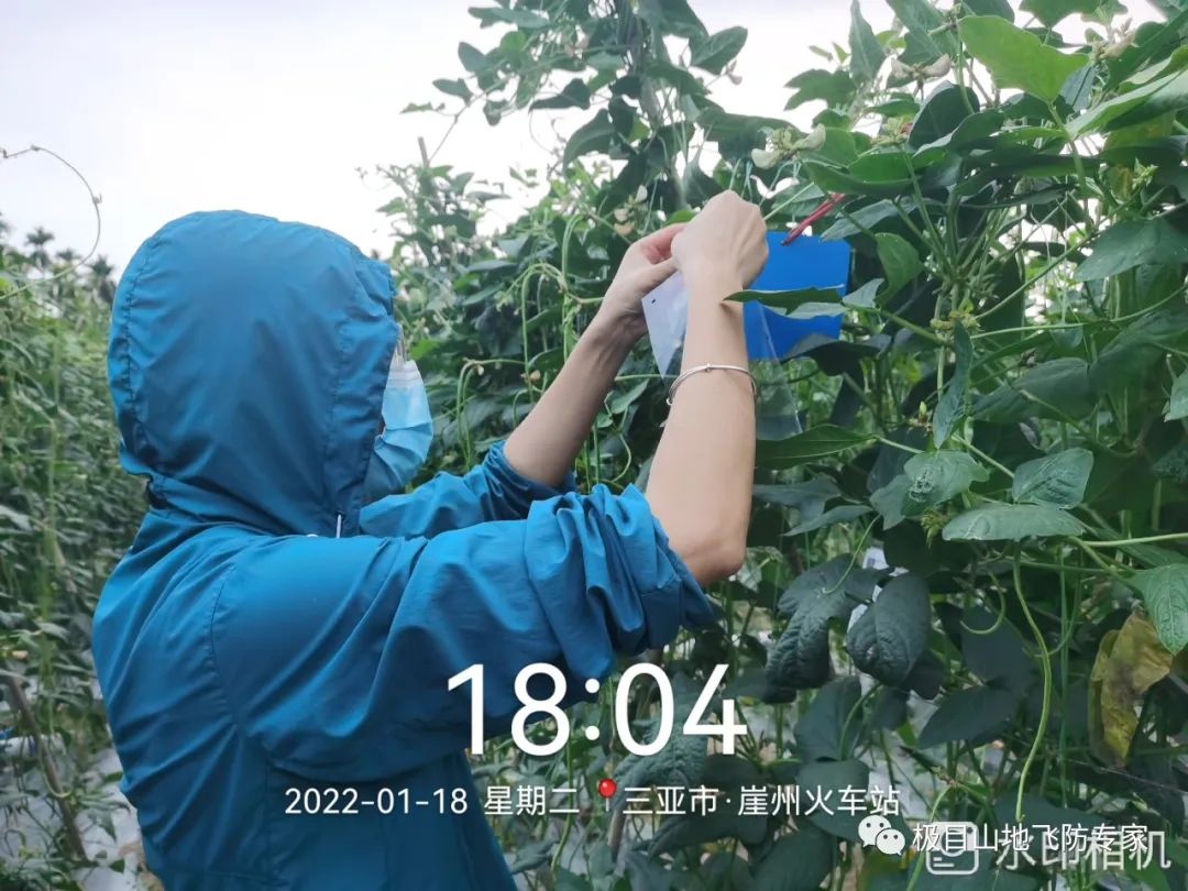 为验证极目植保无人机在豇豆蓟马上的防治效果,极目(海南)智能育种装备有限公司与三亚市热带农业科学研究院联合在三亚崖州区崖城村核心示范区开展三亚市2021年农作物重大病虫害绿色防控暨农药化肥减量增效项目,利用科学药机结合方案,进行豇豆蓟马的田间药效全程试验,从豇豆种植和管理到无人机管控,从生物药剂精准喷施到田间病虫害管理,均取得了良好的防治效果。