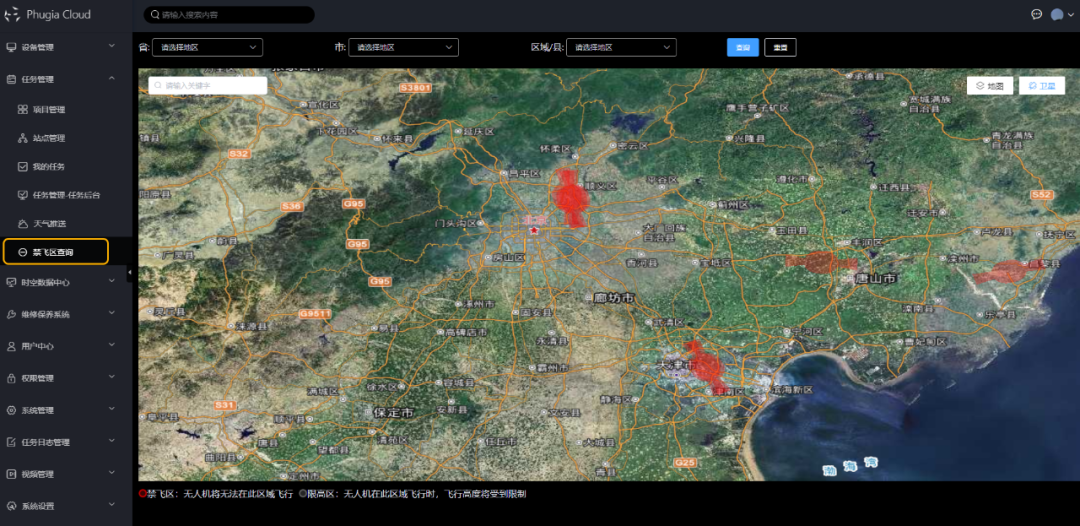 任务只要建立,平台就会自动开启自动识别,点击禁飞区域,界面上的红色区域就会自动展现,并进行规范提醒。在飞行前即可规避风险!