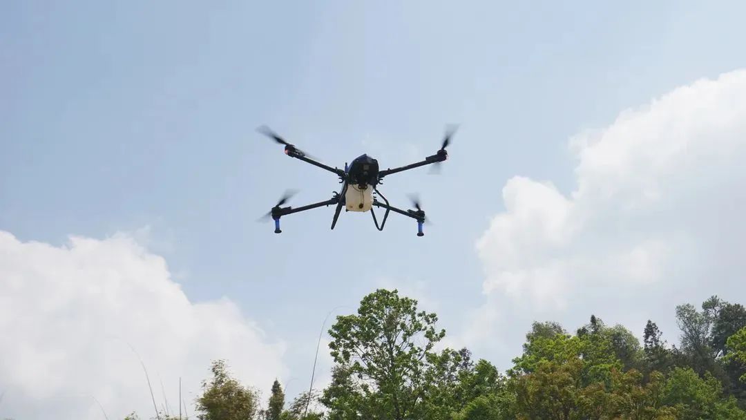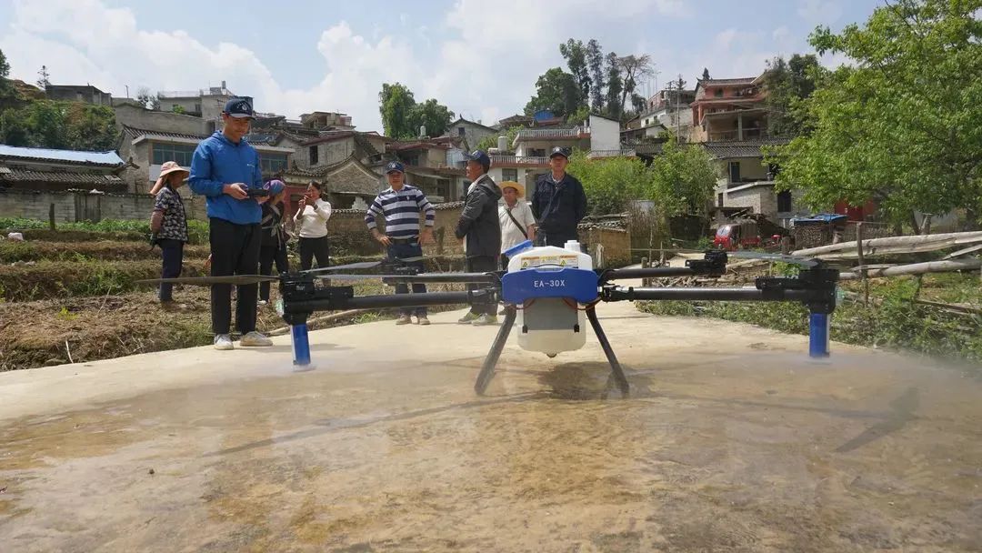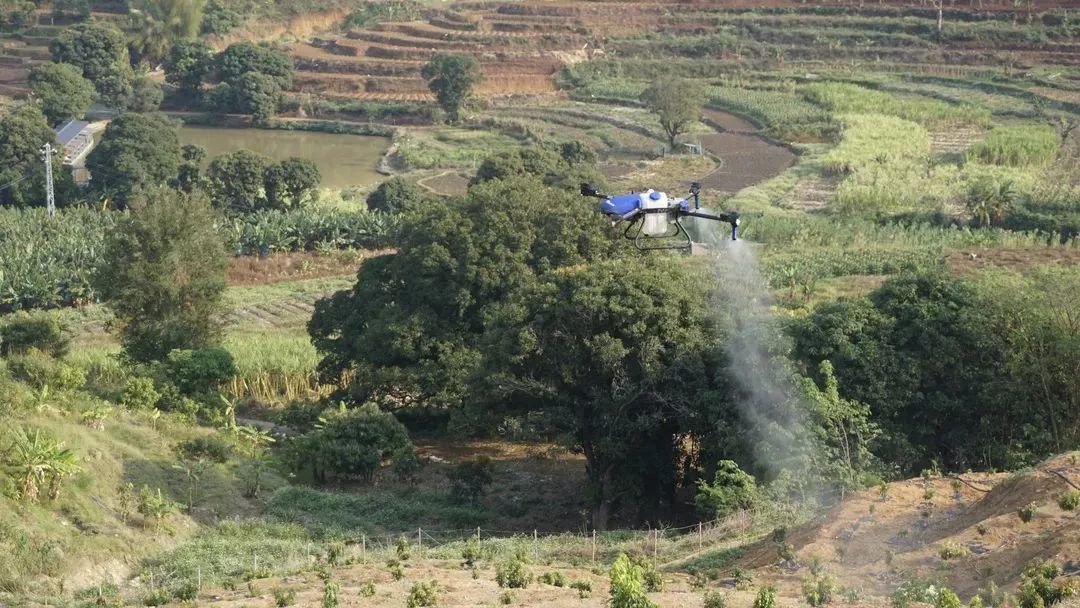 在红河县迤萨镇勐甸村委会勒沙种植基地,技术人员正在调试极目新款植保无人机——EA-30X,在设定好相关参数后,将兑有植保农药的药水倒进了无人机的水箱里,随后无人机起飞,沿着既定航线,在基地上空2-10米处把药水均匀地喷洒在果树上。