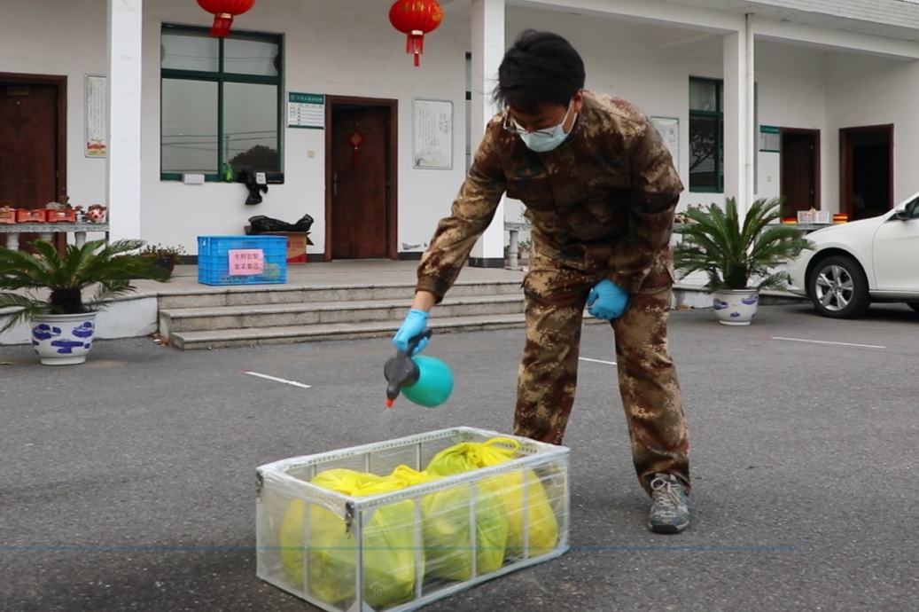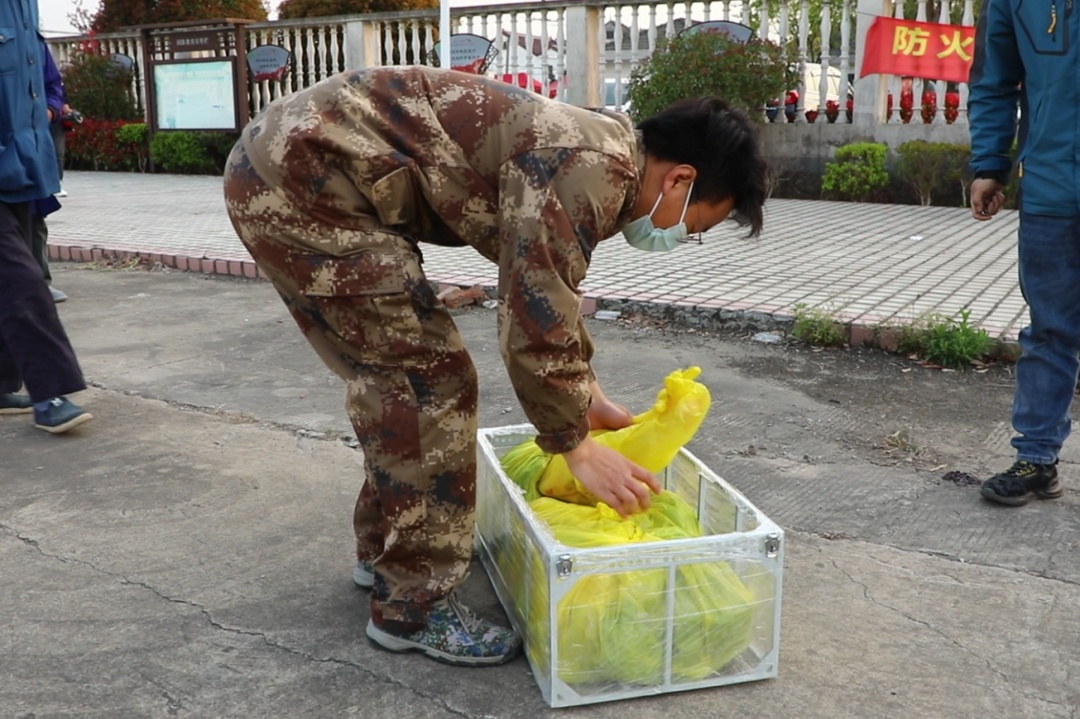 “飞机降落,可以领取了!”几分钟后,无人机飞到了附近的保卫村指定降落地点,村委会工作人员小吴一边用手机记录着这一幕,一边等飞机悬停好后取下物资,并进行了消杀。