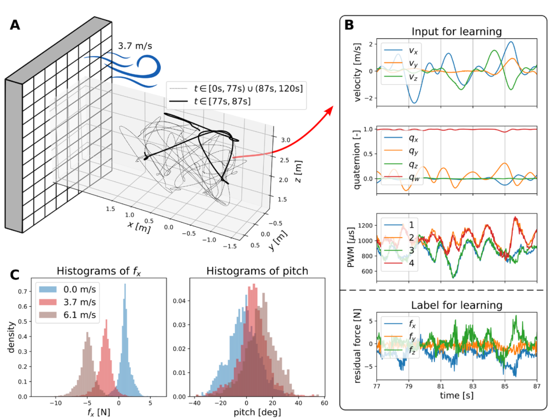 (C) 显示不同风况下数据分布的直方图。左:风效应力的x分量分布,fx。这表明空气动力效应随风的变化而变化。右图:音高分布,作为学习模型输入的状态组件。这表明风条件的变化会导致输入的分布变化。