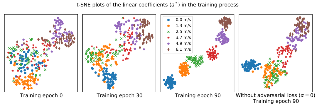 图4 t-SNE图显示了训练过程中线性权重(a*)的演变。随着训练次数的增加,a*的分布变得更加密集,风速簇彼此接近。聚类还有一个物理意义:经过训练收敛后,右上角对应的风速较高。这表明DAIML成功地学习了基函数由所有风条件共享,风相关信息包含在线性权重中。