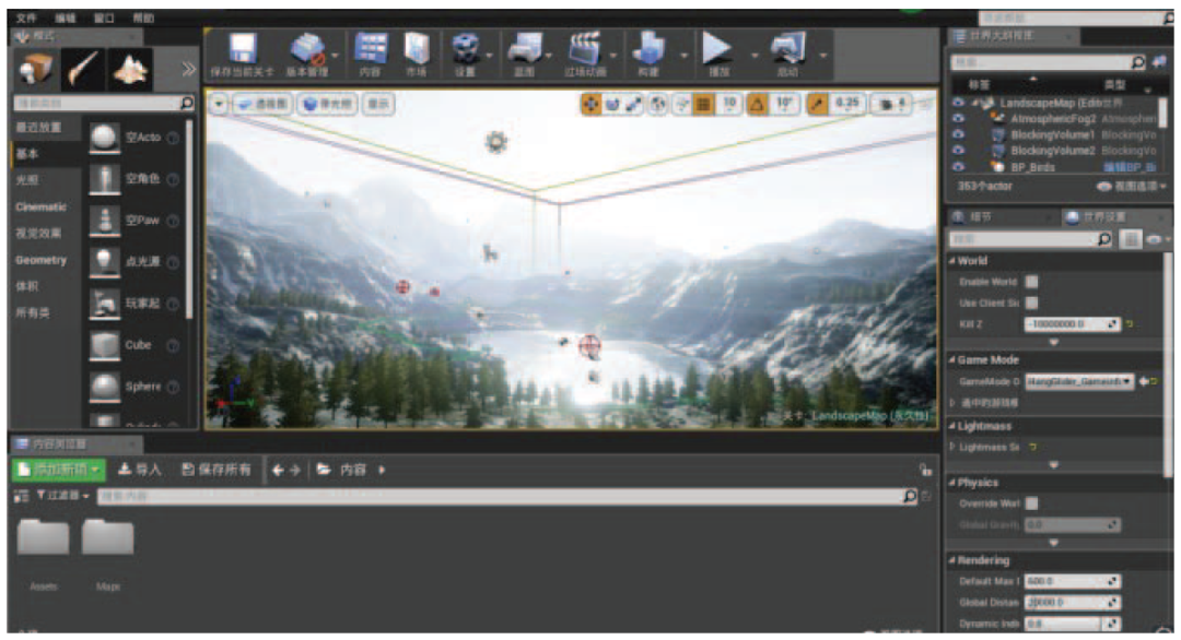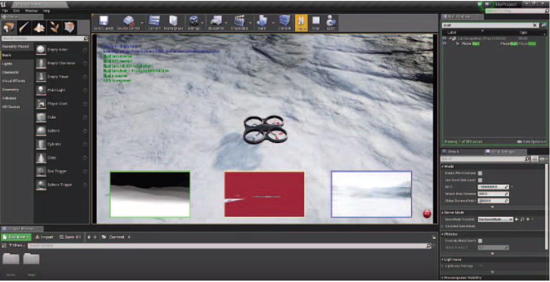 无人机虚拟现实平台场景的构建基于Unreal Engine 4,Unreal Engine 4相比其他引擎在光照和物理渲染方面更胜一筹。无人机深度学习需要准确呈现阴影和光反射等细微的东西,Unreal Engine 4可以更好的实现。EPIC的虚幻商店有很多场景(如:山、街、海平面)可供选择。本文选择了有利于无人机深度学习的“风景山”,“风景山”可以通过虚幻商店免费获取。