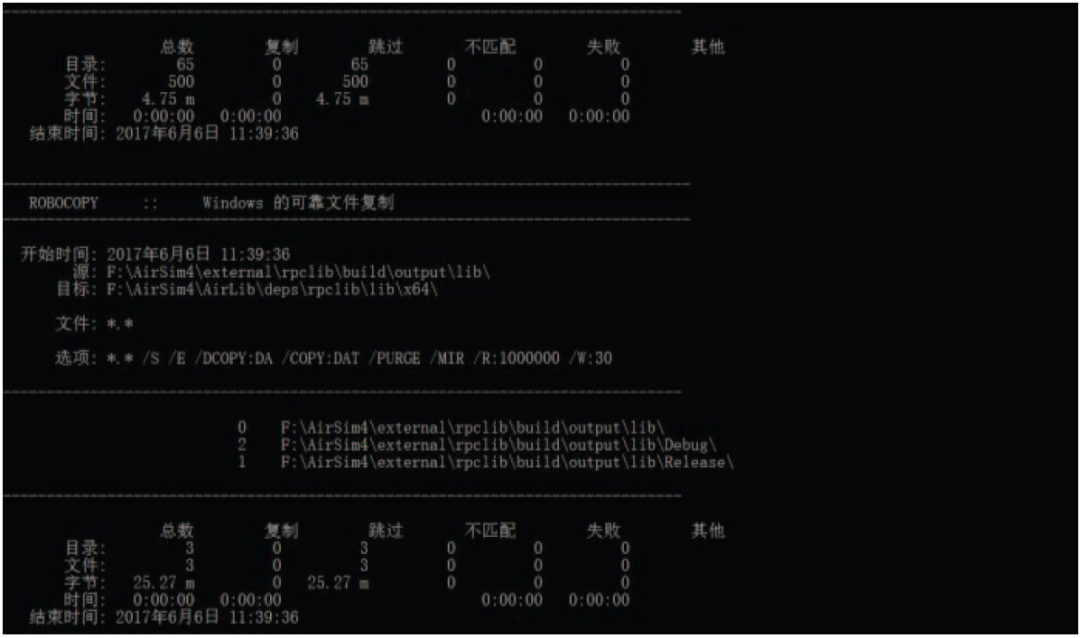 获取源码运行cmd,进入工程目录,运行build.cmd编译,编译成功如图5所示。AirSim编译成功后,需要将编译好的“Plugins”文件夹复制到“Myproject”工程中,此时AirSim源代码的获取和编译就完成了。最后更新飞控,下载QGroundControl,连接PX,选择HIL Quadrocopter X机架,连接Remote Control,无人机虚拟现实平台就可以成功运行。