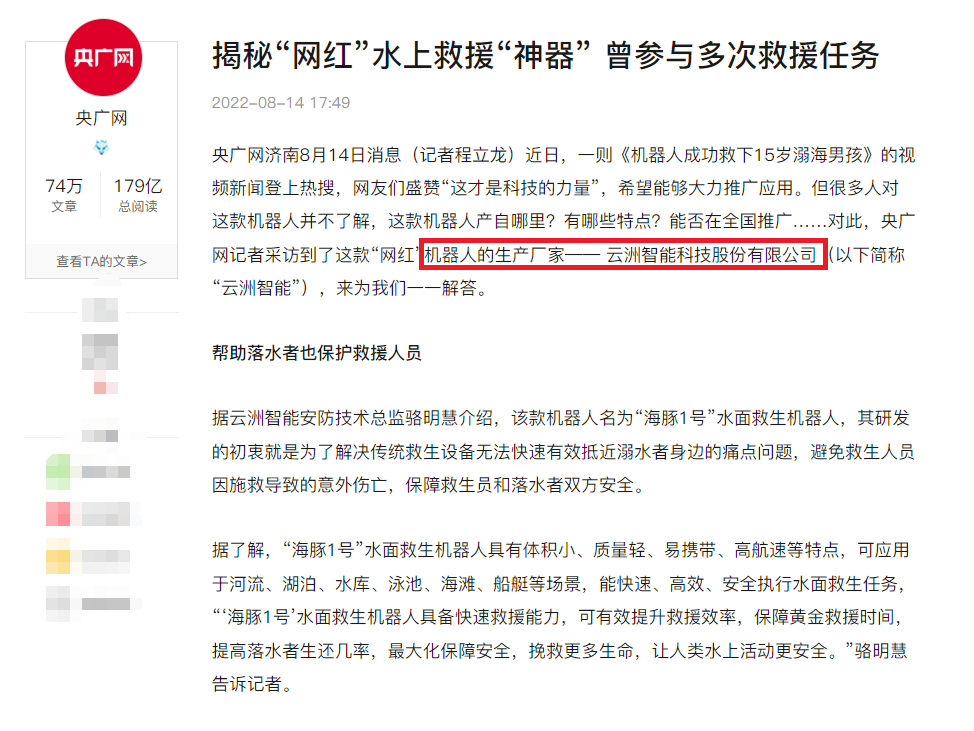 央视《新闻直播间》的报道中提及,“此次救援使用的水上救生机器人名叫海豚1号”,该产品是由云洲智能自主研发、生产的水上应急救援装备,曾先后在珠海万山岛、威海东浦湾海水浴场以及威海荣成等地成功救助落水人员,参与了江西抗洪抢险、河南暴雨救灾等救援任务。
