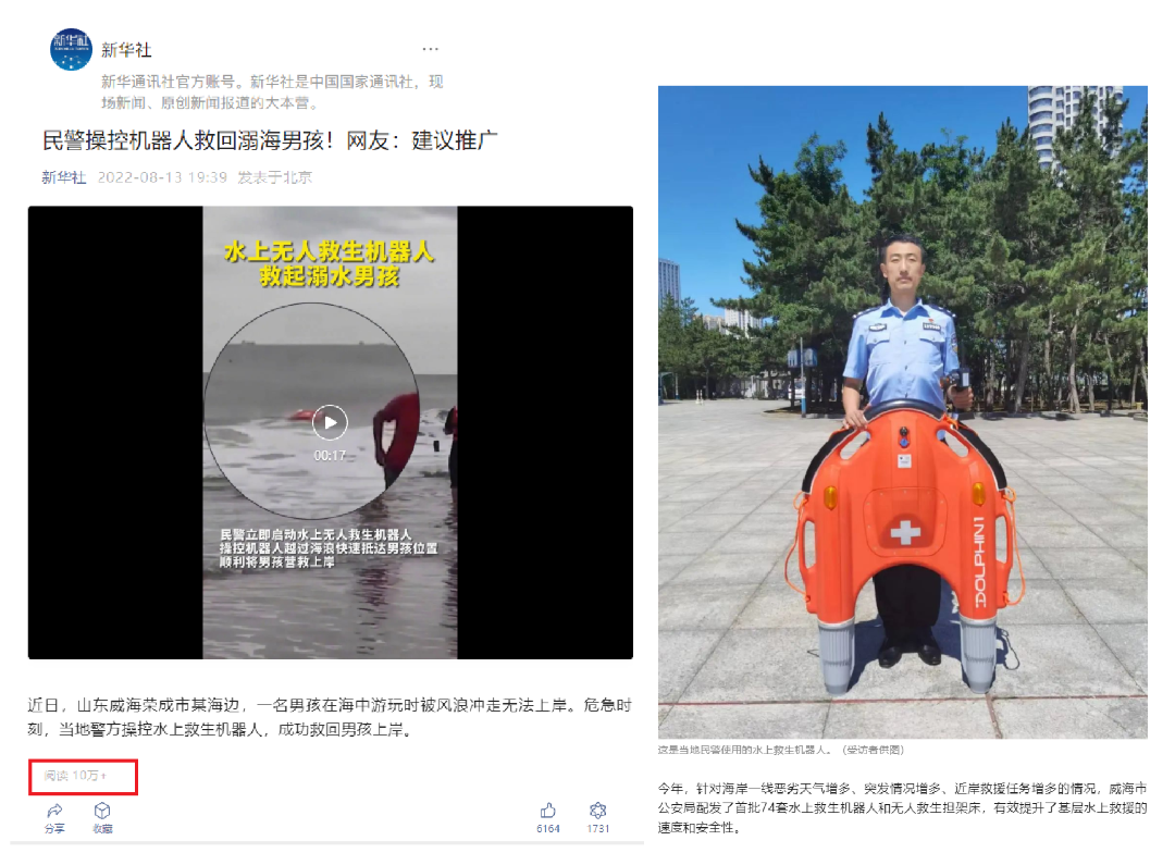 新华社发布“民警操控机器人救回溺海男孩”相关推文,阅读量破10万+