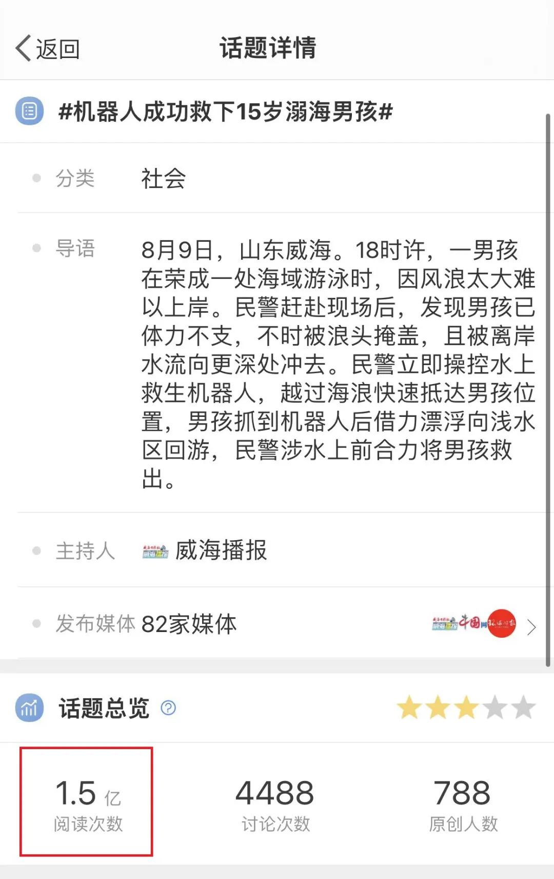 #机器人成功救下15岁溺海男孩#话题在微博阅读次数达1.5亿次