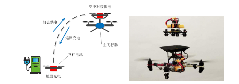 飞行电池技术由Karan等作者提出,当主飞行器在空中使用主电池执行任务时,飞行电池可以飞向主四轴飞行器并停靠到其上面。然后主四轴飞行器将其电池切换到二次电池。一旦二次电池耗尽,会有另外一个电池替代,如此循环重复直到主电池耗尽。主电池只在飞向电池脱离时使用,采用此方法可以大大提高无人机的续航时间。如图7所示为飞行电池的工作方式,飞行电池在充满电后与主飞行器对接实现电池切换,切换完成后自主返回实现地面充电,图8为个飞行电池即将停靠在主四旋翼机上的图示说明。经验证,该系统在一次飞行中通过多次切换电池实现了57分钟的续航时间,而不采用该技术无人机只有12分钟的续航时间。