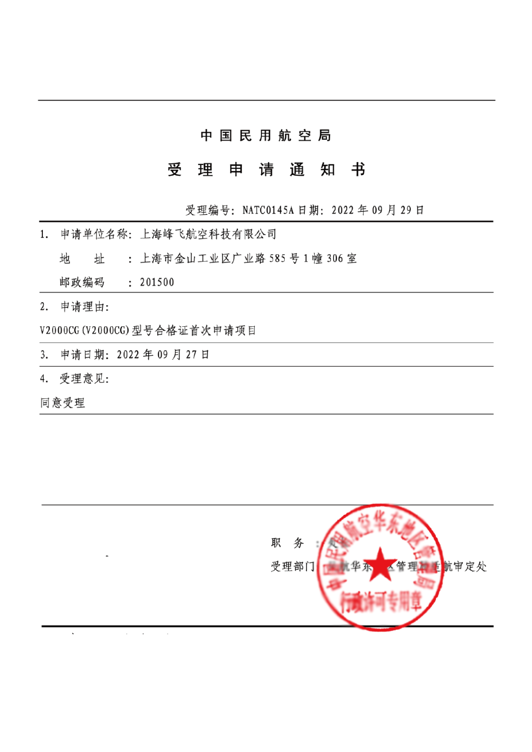 2022年9月29日,中国民航局正式受理了峰飞航空科技V2000CG凯瑞鸥无人驾驶航空器的型号合格证(TC)申请,这也是首款获民航局正式受理型号审定申请的2,000公斤级载物eVTOL飞行器。