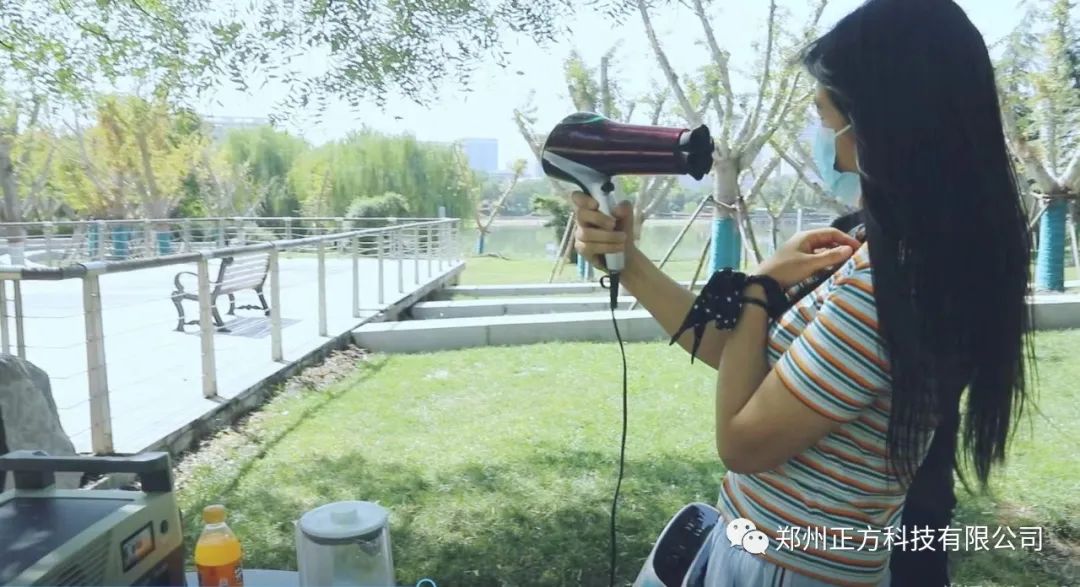 输出功率强大—车载空调和吹风机都撑得住!为了享受美好的假期,考虑到太阳下可能会晒得汗流浃背,我们带了一台功率为3000瓦的车载空调;爱美的小姐姐为了自己长发飘飘更漂亮,带了一个博世1800瓦的大功率吹风机,其他的笔记本电脑、3000瓦的烧烤架、无人小飞机、电水壶、电水杯都带上了。结果非常让我们满意,千乘动力QX3600户外便携电站存储电量为3.6kwh,最大输出功率为3200瓦,所以功率分别为1800瓦的吹风机,2500瓦的烧烤炉,3000瓦的车载空调完全带得动。这是车载空调正在测试,冷风袭来的那一刻,站在一旁的帅哥绽放出心旷神怡的笑容。