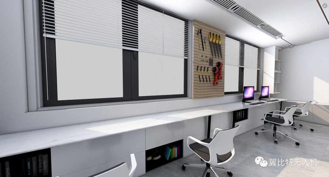 无人机维保区域,配置工具墙及工作台便于库房管理人员进行无人机调试,组装,保养,维修等操作。