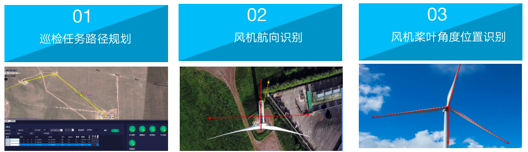 在无人机全自主风机巡检系统控制下,只需发送起飞指令,无人机可完成巡检任务路径自主规划,通过风机航向识别、风机桨叶角度识别找准风机轮毂中心完成识别,借助无人机飞行逼近控制,无人机可飞近风机中心轮毂,并依据已采集的数据通过无人机路径动态规划技术完成自动巡检过程。