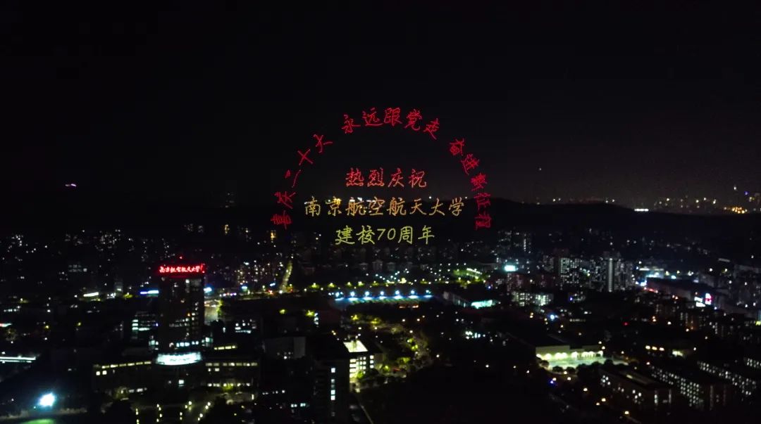 随后,“热烈庆祝南京航空航天大学建校70周年”文字展现,无人机为南航送上祝福。
