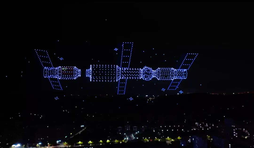 随着一阵呼啸声响起,无人机缓缓升起,2022架无人机拼出各种造型,一场无人机编队表演炫酷上演。夜空中,齿轮转动,一架飞机绕着齿轮飞过,时间从“1952 年 ”转动至 “2022 年”。